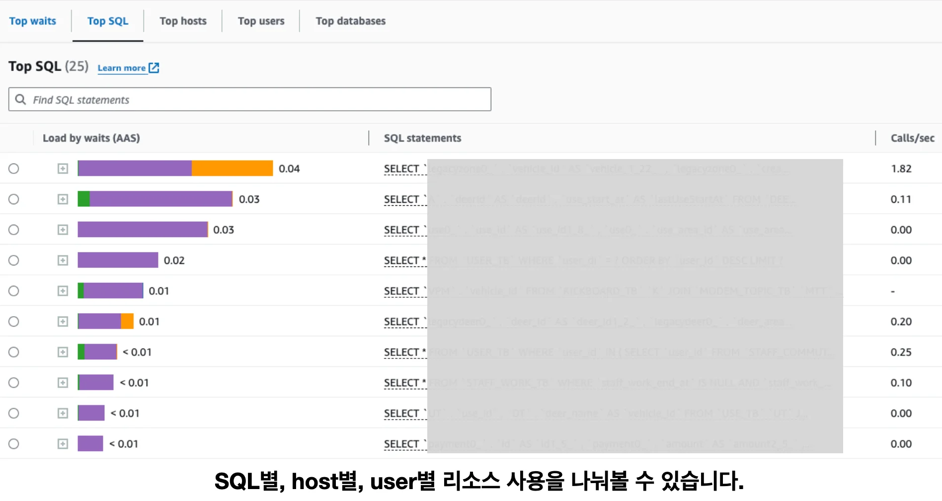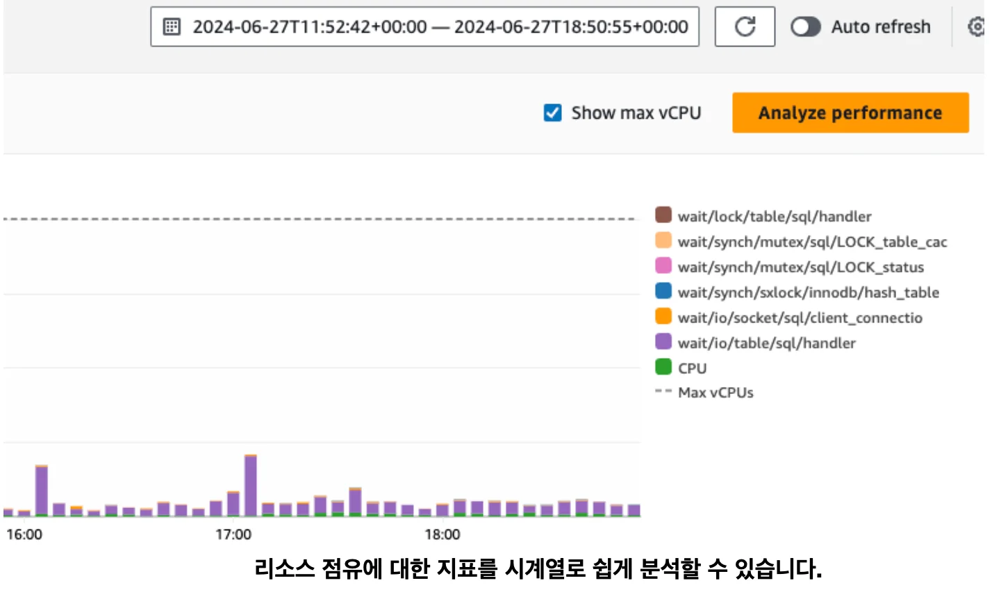 RDS Performance Insights: 어플리케이션에서 작성한 쿼리가 인프라 지표라고 보기에 약간 애매한 영역에 있을 수도 있으나, 특정 쿼리의 DB 리소스 점유를 분석한 것이므로 일단은 인프라 지표로 분류하였습니다. AWS에서는 DB 인스턴스의 기본적인 지표를 제공하는 것에서 나아가 DB 내부에서 수행되는 쿼리들 중 어떤 쿼리가 리소스를 얼마나 많이 차지하는지에 대한 해상도 높은 지표를 제공합니다. 이 모니터링 기능을 잘 활용하면 서비스에서 문제가 되는 느린 쿼리들을 추적하고 개선하는 데에 큰 도움이 됩니다.