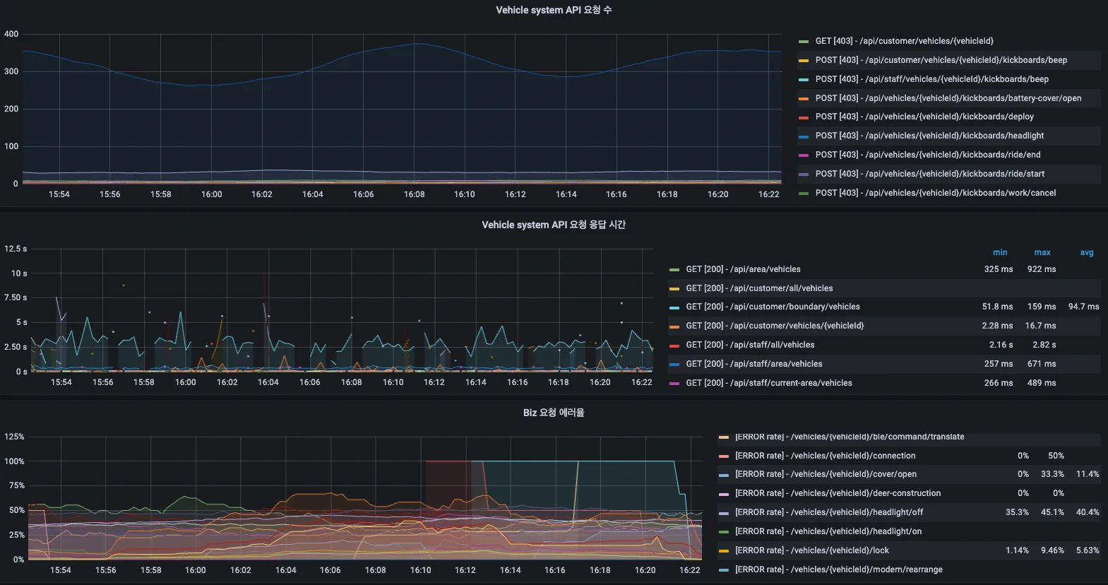 이러한 지표들은 서비스가 정상적으로 동작하고 있는지 한눈에 알아볼 수 있도록 하며, 서비스 장애 상황에서 어느 부분이 문제인지 빠르게 특정할 수 있도록 도와줍니다. HTTP 요청 관련 지표들은 서비스 개발에도 무척 유용하게 사용할 수 있습니다. 이 지표를 모니터링하기 시작한 뒤로부터 하드웨어 조작 요청에 대한 성공 & 실패율이나 지연 시간을 시계열로 기록할 수 있게 되었습니다. 그 뒤로 위에서 언급한 ‘사례 1’과 같은 문제 상황에서 아래와 같은 대화가 가능해졌습니다.
