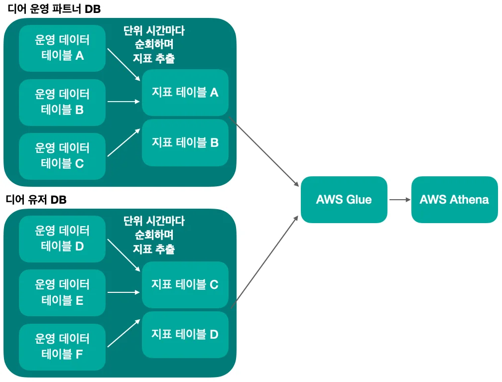 현재 디어에서는 운영 DB로 AWS RDS를 사용하고 있으며, 시스템별로 독립적인 DB를 관리합니다. 분 단위, 시간 단위, 일 단위로 분석해야 하는 지표들을 운영 데이터로부터 추출하여 별도 테이블에 적재한 뒤에 데이터 분석에 활용합니다. 서로 다른 DB에 있는 데이터들을 함께 모아 분석해야 하는 경우에는 AWS Glue를 활용해 S3에 데이터를 적재하고, Athena query를 활용하여 분석할 수 있습니다.