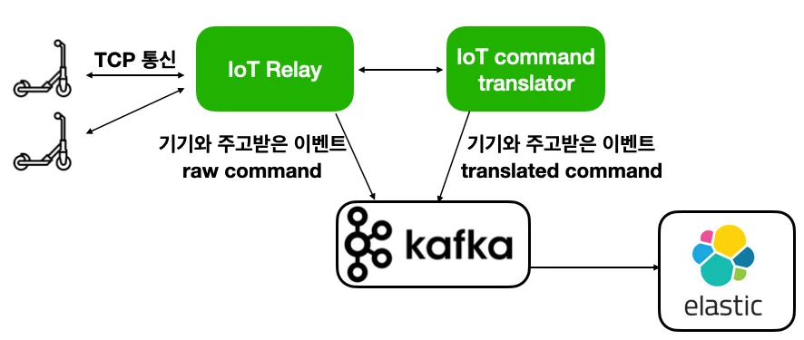 디어에서 관리하는 각각의 킥보드 기기는 모두 독립적인 IoT 기기이며, 기기에서 발생하는 이벤트들을 TCP 통신을 이용하여 지속적으로 서버에 스트리밍합니다. 기기 위치, 배터리 상태, 기기 에러 로그, 기기 넘어짐 여부, 기기 누적 주행 거리 등 다양한 이벤트가 존재하며, 이러한 이벤트를 시계열로 잘 모으면 하드웨어 기기를 관리하는 데 매우 중요한 정보가 됩니다. 2만 대 기기에서 나오는 이벤트들을 모두 쌓으면 한 달에도 10억 건이 넘는 하드웨어 로그들이 쌓입니다. 서비스에서 사용하는 RDB로는 이 로그들을 감당하기 매우 어렵습니다. 이에 디어 서비스에서는 이러한 이벤트 로그들을 Kafka와 Elastic cloud를 활용하여 적재하고 분석하고 있습니다.