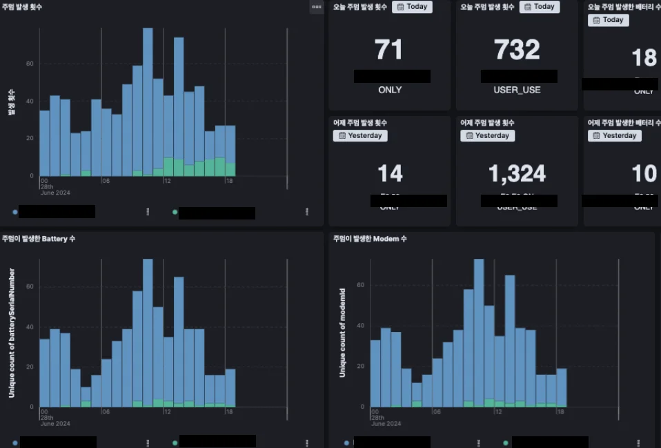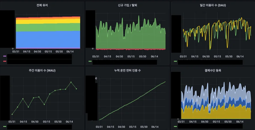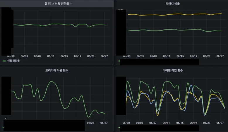 글 서두에서 언급한 ‘사례 3’과 같은 문제는 실제 운영 데이터와 모니터링을 위한 서비스 지표를 제대로 분리하지 않고 관리하였기 때문에 발생한 문제입니다. 6개월 이상의 긴 시간의 데이터 추이를 보기 위해 시간축을 길게 늘렸는데, 실세 서비스 운영 테이블에 무거운 쿼리가 나가는 바람에 서비스 장애로 이어진 것이죠. 말도 안 되는 상황이라고 생각할 수 있지만, 빠르게 지표를 보기 위해 제대로 지표를 분리하지 않고 운영 데이터를 직접 가공하여 지표 보드에 연결하여 사용하다 보면 위와 같은 문제가 발생할 수 있습니다. 서비스 지표는 실제 운영 데이터와 분리하여 관리하는 것이 안전하며, 서비스 규모에 따라 파이프라인의 규모를 적절하게 유지하여 최적의 리소스로 관리해야 합니다. 앞서와 같은 방식으로 디어 서비스는 운영 데이터로부터 서비스 지표를 분리하였으며, 서비스에서 필요한 데이터를 운영 데이터에 직접 접근하지 않고도 빠르게 분석할 수 있는 환경을 구축하였습니다. 자세한 수치나 항목을 공개할 수는 없지만, 디어에서는 아래와 같은 형태로 지표들을 모니터링 하고있습니다.
