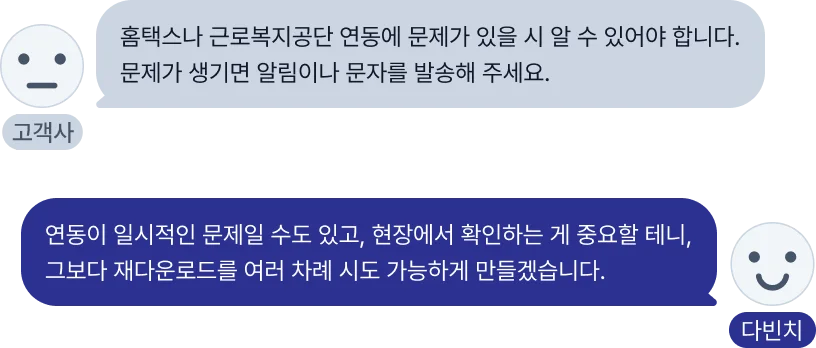 고객사의 최초 요구사항은 ‘외부 시스템 문제로 자료 다운로드가 되지 않을 때, 알림이나 문자를 휴대폰으로 발송해 문제 상황임을 알 수 있게 해달라’는 것이었습니다. 해당 방식으로 개발하는 건 쉽습니다. 하지만 외부 시스템에 일시적으로 문제가 생긴 걸 수도 있고, 영업 사원이 영업 중 알림이나 문자를 확인하는 것은 불편합니다. 따라서 웹에서 실시간 확인하도록 하는 게 가장 좋은 해결책이라고 판단했습니다.