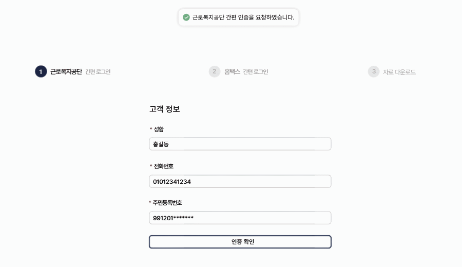 예시로 필요 자료를 다운로드 받기 위해서는 홈택스, 근로복지공단 로그인을 위해 각각 두 번의 카카오톡 본인인증이 필요합니다. 이름과 주민등록번호, 휴대폰 번호를 입력하면 카카오톡으로 본인인증 메시지가 전송됩니다. 따라서 개인 정보 입력이 두 번 필요한데요, 다빈치에서는 첫 번째 인증 때 입력한 정보를 두 번째 인증 때 재사용해 미리 입력하는 식으로 불필요한 사용자 작업을 줄였습니다.